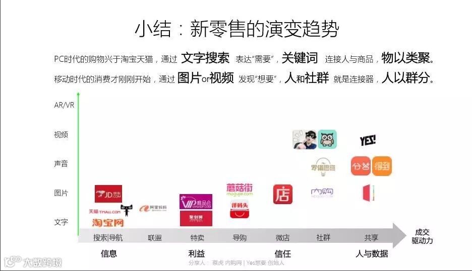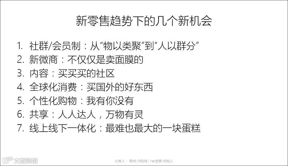 PC时代的购物兴于淘宝天猫,通过文字搜索,用户表达需要,通过关健词连接人与商品,物以类聚,在移动时代的消费才刚刚开始,更多用户通过图片视频发现自己想要什么,人和社群本身就是连接器,人以群分。而商品的表达方式正在从文字图片,演变到声音视频直播的时代,未来也许会融入到VR虚拟现实的场景中。我和大家分享一下,在这种新零售驱使下存在的几个机会: