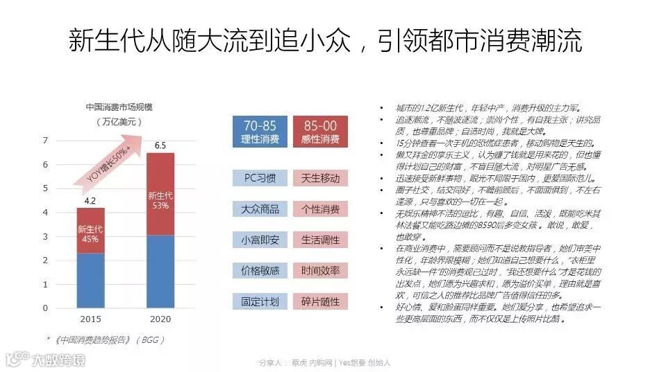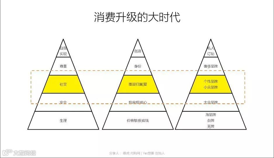 消费升级背景下,越来越多的年轻人需求,特别在一二线城市,已经升级到社交层面,而不仅仅是“怕麻烦”的安全需求,更非温饱阶段的生理需求,年轻人更关注自己用的商品是否符合自己的个性化需求、是否在自己的圈层里获得认可,他们不盲目随大流,对大众品牌提不起兴趣,他们更在乎小众品牌,他们不再相信中央电视台的广告,不相信脑白金、七匹狼的宣传方式,而是看和他一类的潮人用什么品牌,纹什么身、背什么包,他们是一群讲究生活品质与个性调调的人。