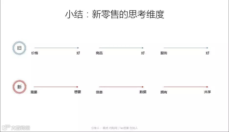 最后,小结一下我的思考与观点。传统模式的电商与传统零售其实是一样的,需要考虑三件核心事情:商品好不好、价格好不好、服务好不好。但新电商,或者更准确的说新零售,则需要思考怎么能够满足用户从需要到想要、从信息到数据,从一定让用户购买而拥有,变成用户共享的新路径。
