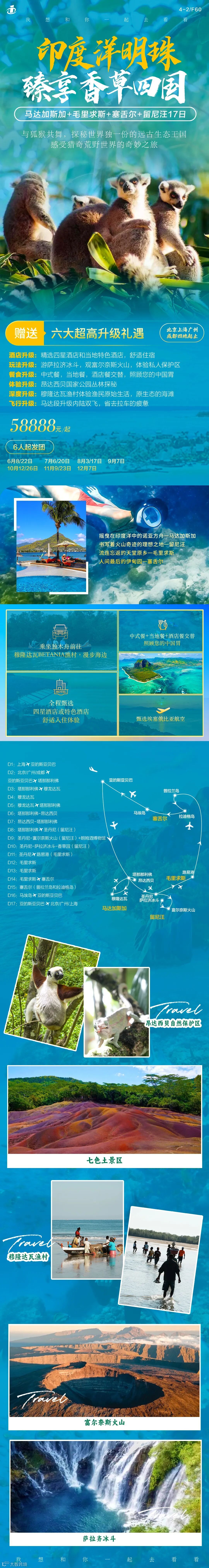 从马达加斯加的侏罗纪雨林,到毛里求斯的火山海湾;从塞舌尔的蜜月天堂,到留尼汪的冰火奇境——香草四国,用17天解锁地球最狂野的浪漫。