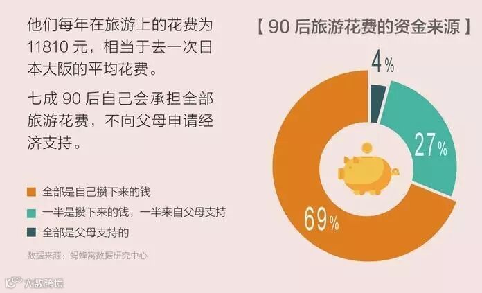 另一方面,90后每年在旅行上平均花费11810元。69%的人表示,自己会承担全部的旅游花费。
