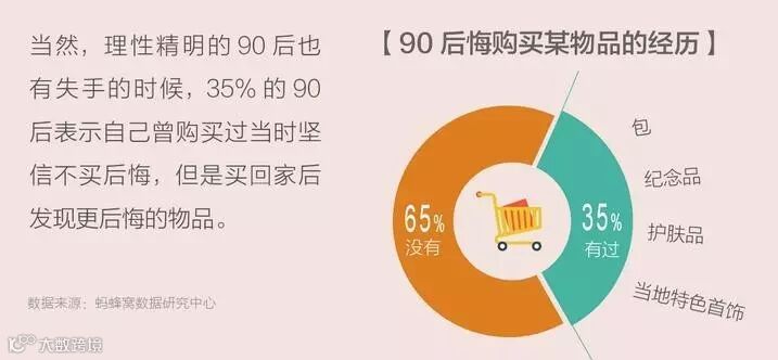 当然,偶尔也会有失手的时候,35%的90后表示,有冲动购物事后后悔的经历。