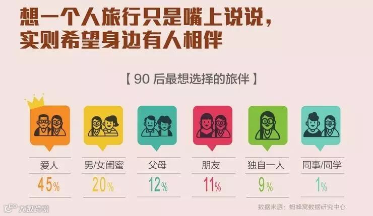调查表明,大多数90后仍然希望与亲近的人一同旅行,喜欢独自旅行的仅占9%。其中,45%的90后,最想和爱人一起去旅行,其次是朋友及父母。