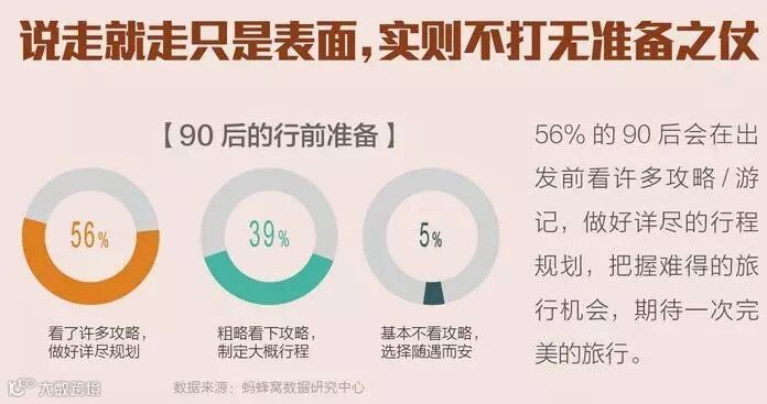 同时,“说走就走”旅行占比比想象中的低很多,报告显示,56%的90后会在出发前阅读攻略或游记,仅有5%会真的毫无准备地“说走就走”。