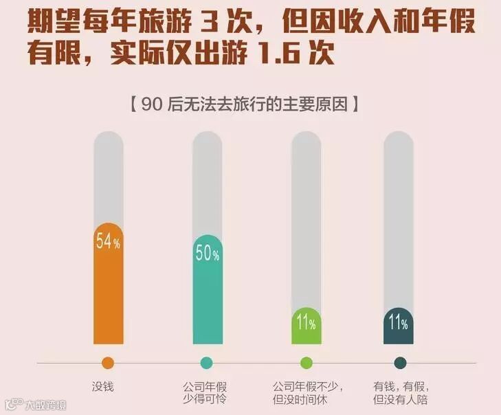 据报告显示,90后的心理期待是一年能旅行3次,但因为没钱和没假,实际仅平均出行1.6次。