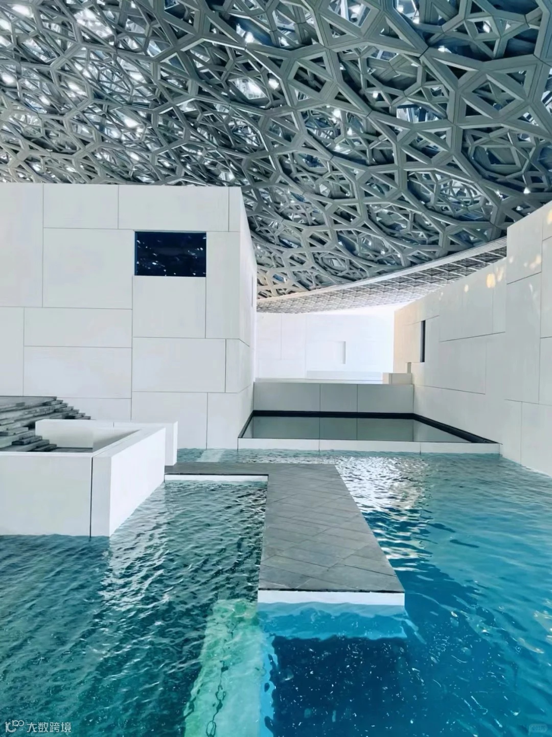 海上博物馆卢浮宫,“光之雨”穹顶,直径180米的巨型银顶由7850颗星形几何结构编织而成,灵感源自阿联酋棕榈叶的透光效果。阳光穿过八层镂空层,在馆内形成流动的光斑,宛如“阳光雨”。馆内将不同的文明并置于同一空间,通过人们跨越地缘、国籍和历史的经验共享,阐明各种文明的相似之处,并实现交流互通。