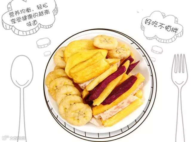 越南进口果蔬干,原装进口,真材实料,香甜脆爽,浓郁诱人,内含菠萝蜜、芭蕉、芋头、甘薯,鲜美自然,无任何防腐剂,原滋原味,传统工艺,感受水果带来的幸福。好吃,不怕胖。