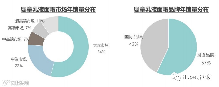 婴童乳液面霜中大众市场及中端市场保持高占比,国货品牌保持领先。