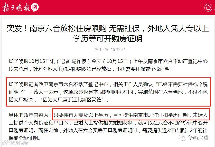 据中国房地产报文章也确认了该消息的真实性。"对于社保和个税并无要求。"南京六合不动产登记中心相关工作人员表示,新出政策只针对南京六合区域,只要有大专及以上学历,提供南京市居住证和学历证明,未婚的提供个人身份证和户口本;已婚的提供相关婚姻材料,就可以在六合不动产登记中心开具购房证明。