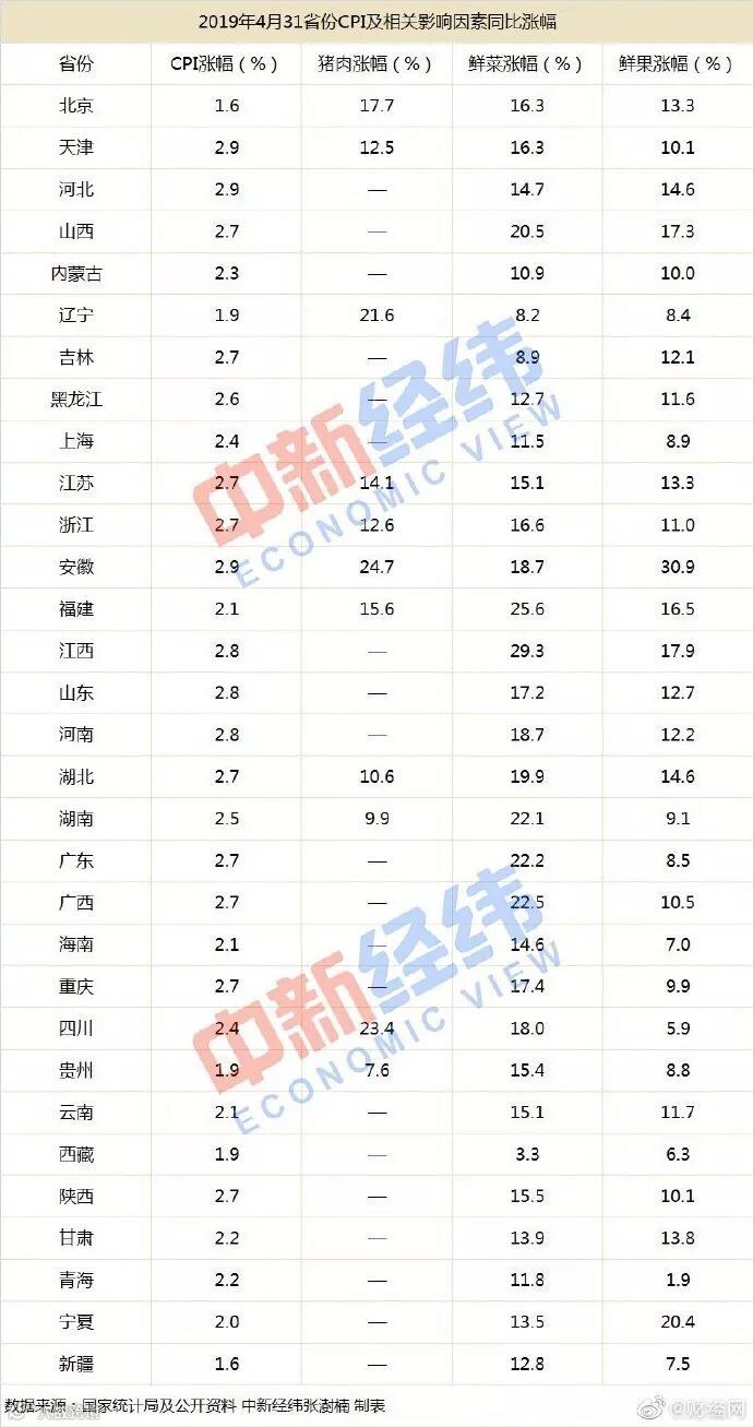 4月16省份CPI同比涨幅超全国,涨幅最高的为天津、河北与安徽,达2.9%。分类别看,鲜果类同比涨幅超全国的有13省份,安徽涨幅达30.9%,上涨最多;猪肉上,从已公布涨幅的省份中看,安徽上涨最多,达24.7%;其次是四川,涨23.4%。