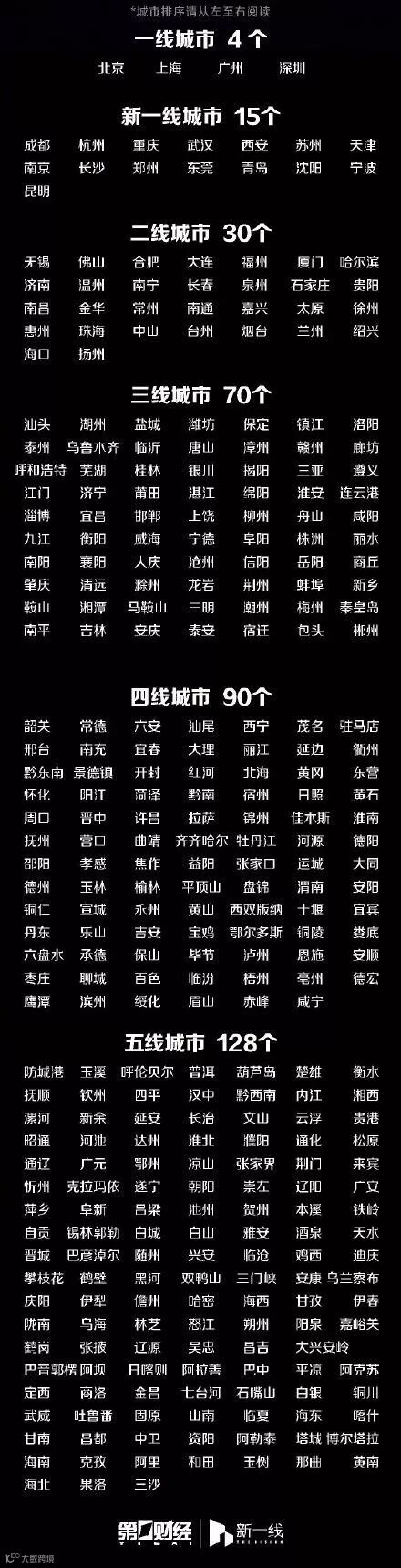 2019新一线城市排名发布,去年的榜单中,一线城市略微调换了座次,但今年又变了回来,排序仍是北上广深。2019年,15座新一线城市依次为成都、杭州、重庆、武汉、西安、苏州、天津、南京、长沙、郑州、东莞、青岛、沈阳、宁波、昆明。头部4座新一线城市的位次相对稳定,无锡则继2017年之后再一次跌出这一梯队。