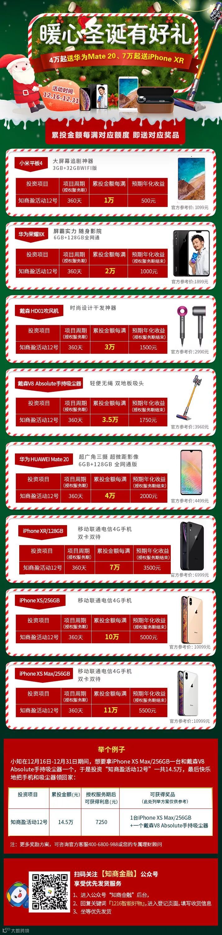 7.如需提前拿到奖品,可在投资后至公众号“知商金融”后台回复“1216智能好物”登记收货信息,或联系在线客服,及致电热线400-6800-988登记确认,我们将提前并优先为您安排手机的采购和发放,请您耐心等待;