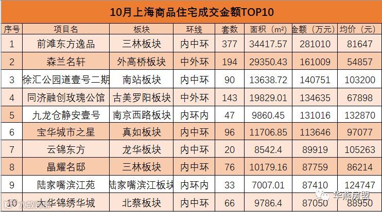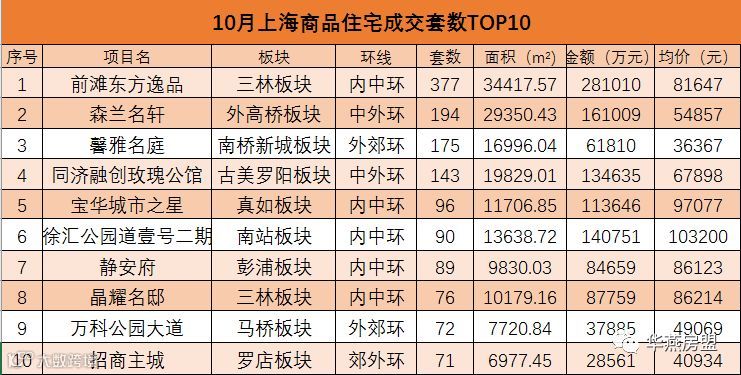 具体项目而言,10月上海商品住宅成交排行榜上,无论是成交金额还是销售套数,三林板块的明星项目前滩东方逸品均拔得头筹,以28.1亿的总销及377套销量排在首位。榜单内中环以内项目占据8席,这也是造成10月成交均价突飞猛涨的最主要原因,说明房价并没有上涨,而是市场已经变得冷热不均。
