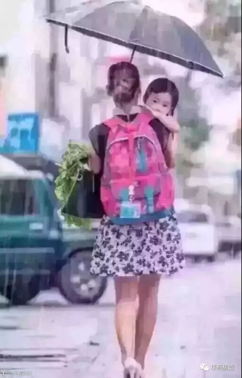 左手撑伞,右手抱娃