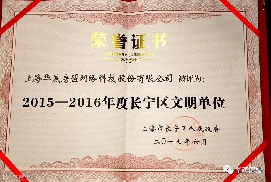 经上海市长宁区人民政府评定,华燕房盟再次荣获“2015-2016年度长宁区文明单位”称号。至此,华燕房盟已连续十年获得了该项殊荣。