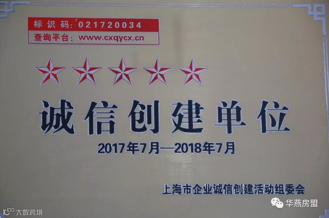 经上海市“企业诚信创建”活动组委会审核,华燕房盟近日获评上海市“五星级诚信创建单位”称号,华燕房盟已连续六年获此殊荣。