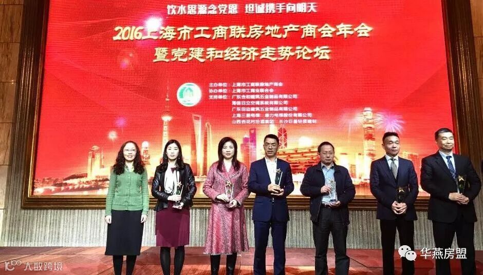 2016上海市工商联房地产商会年会召开,华燕房盟荣获“行业创新奖”和“优秀党建奖”,胡书芳董事长荣膺“商会之星奖”。