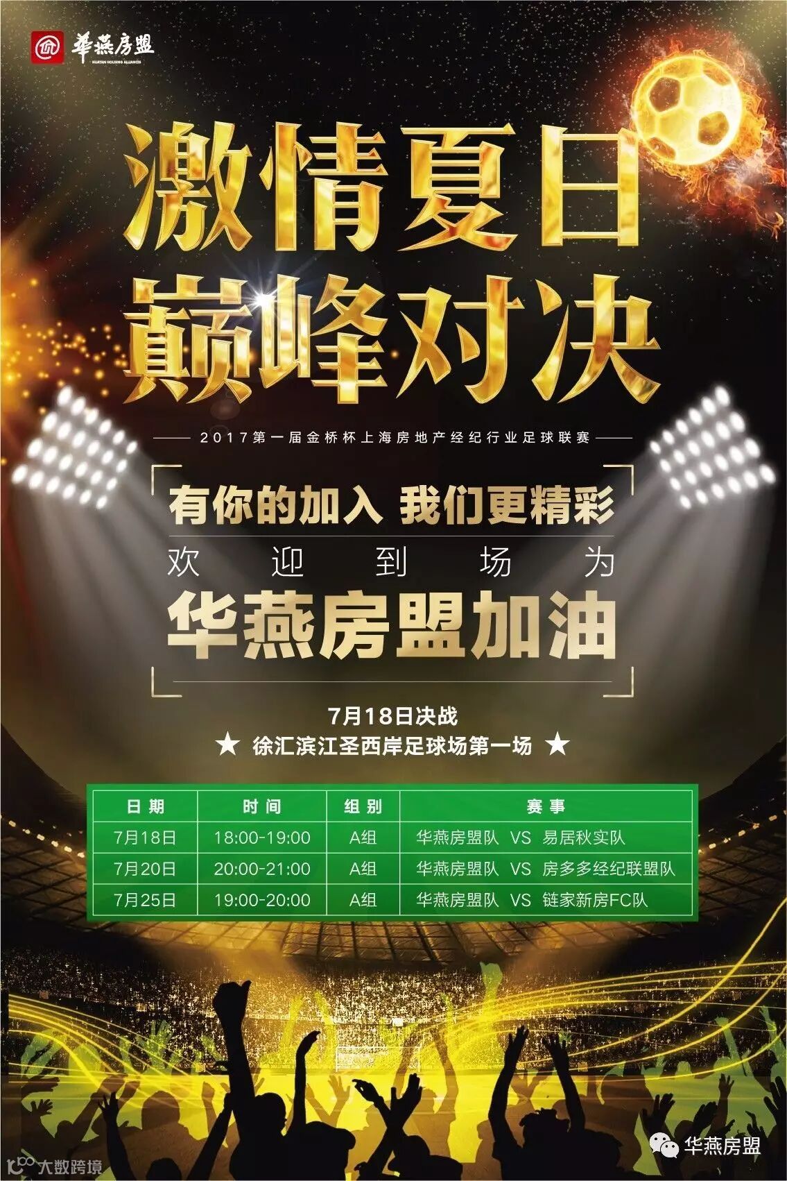 来自华燕房盟、易居、世联、链家、我爱我家、房多多组成的16支队伍鏖战绿茵场,上海市房地产行业协会常务会长陈亮为联赛开幕式致辞,现场更有身材火辣的足球宝贝在现场奉献激情表演。"华燕房盟队"和"易居秋实队"率先出战,为第一届"金桥杯"上海房产经纪行业足球大赛的激烈鏖战打响第一枪。