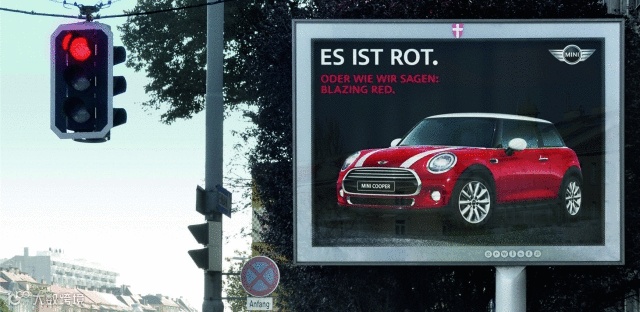 交通信号灯颜色发生变化,旁边广告牌上的经典Mini的车身颜色也会随之变化。