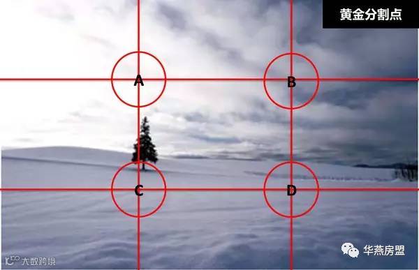 图中ABCD为四个黄金分割的关键点,只要把关键物体和视觉中心放在任意一个黑点上,就能得到很好地构图比例。