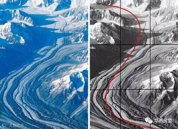 将水平和竖直方向平分为3份,平分线和它们的交点就是关键位置。比如风光摄影中,可以将地平线置于横向构图中下面的一条平分线上