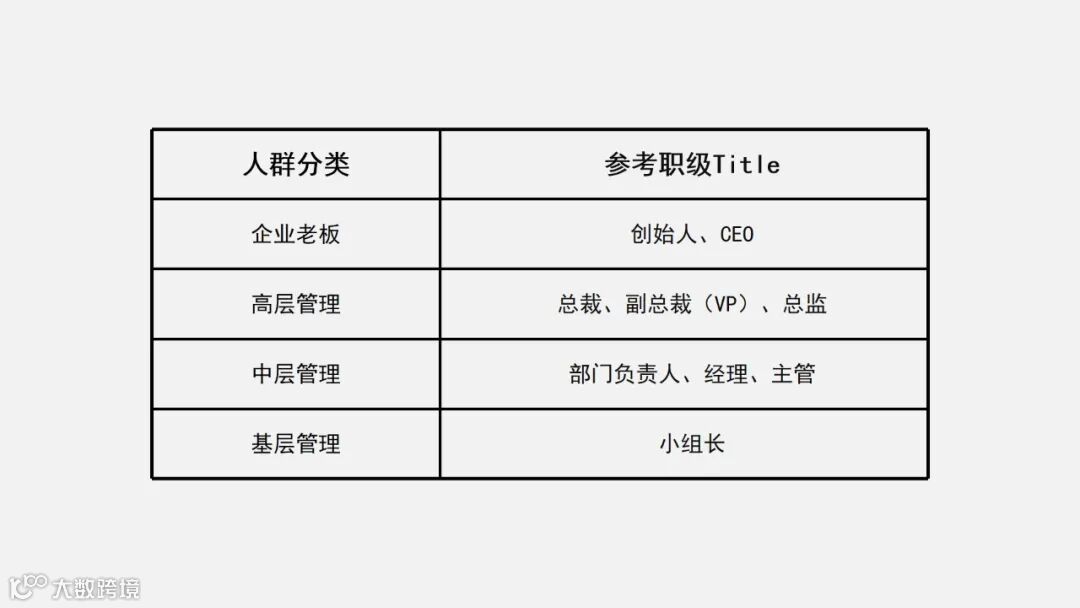 *参考职级取决于各公司对其管理职能岗位的划分,并没有非常一致的划分标准