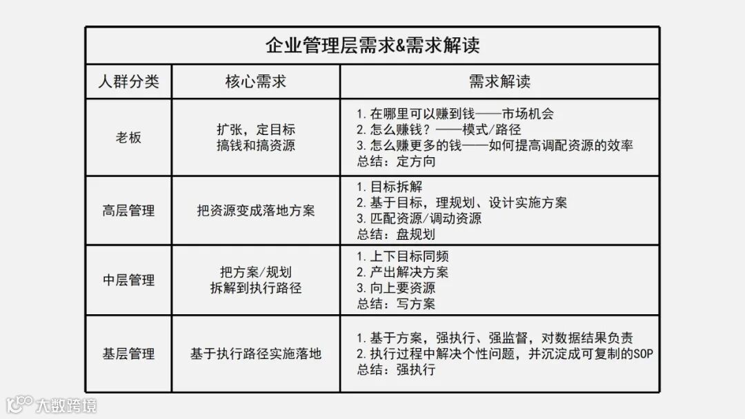 ④ 基层管理是要基于中层的方案,做好执行,过程严格监督,把方案最终落地。