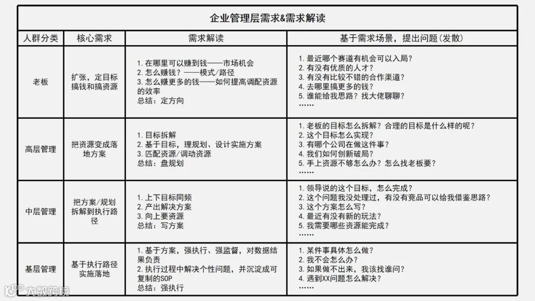 比如,基层管理在核心目标需求场景下,ta 会提出什么问题?