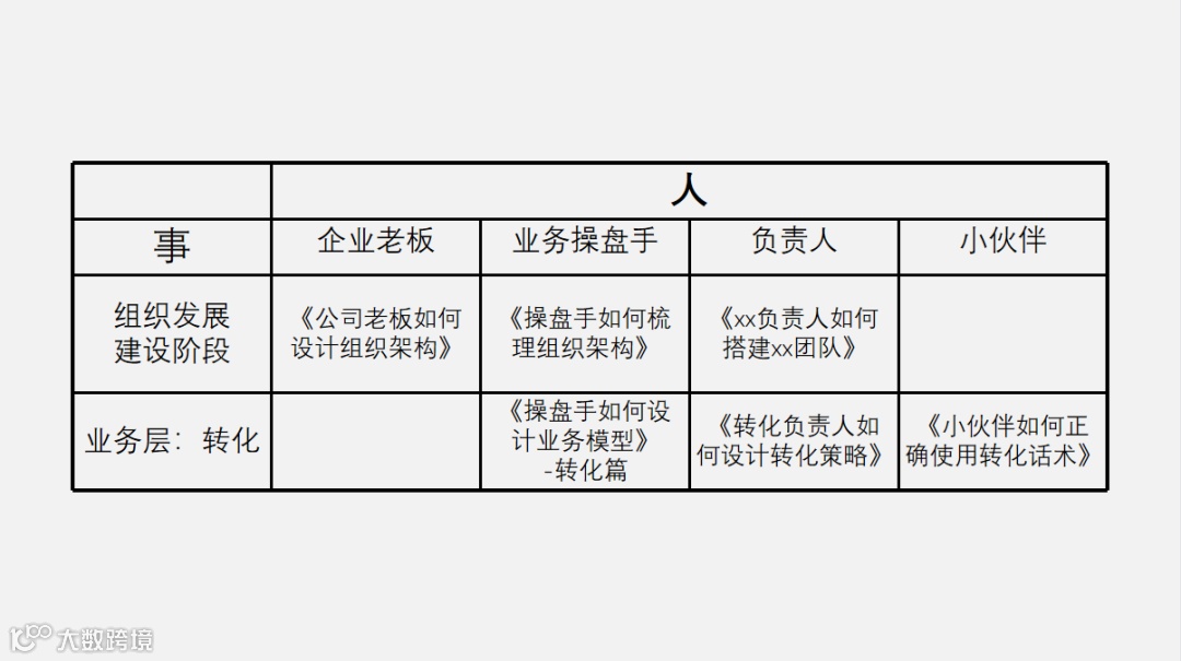 以求音为例,求音是一家商业咨询公司。那基于我们的业务目标“为企业提供增长陪跑服务”,其中包括提供“顾问咨询服务、项目陪跑服务、人才服务、商业资讯服务等”几项业务内容。