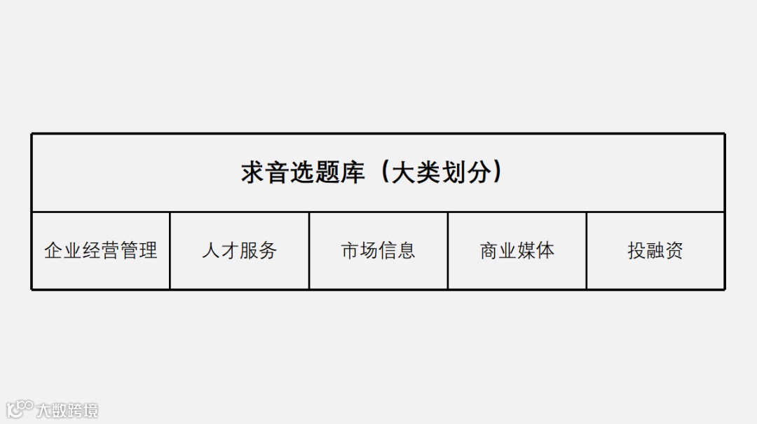 回到求音的例子,我们经过“确定内容方向-拆解知识点-组合知识点”最终得出了“企业经营管理”板块下的 5 个模块的选题内容,这里展示一下这 5 个模块的选题库。