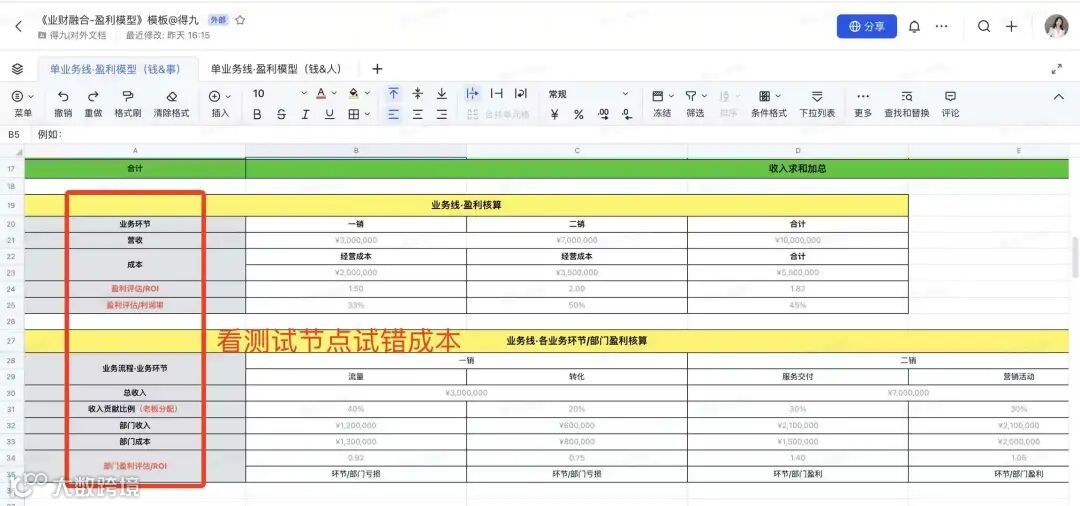 下面这张图是《业财融合·盈利模型》这个工具,可以直接核算出整体试错的成本收入预算,也可以算出局部某个环节的数据。