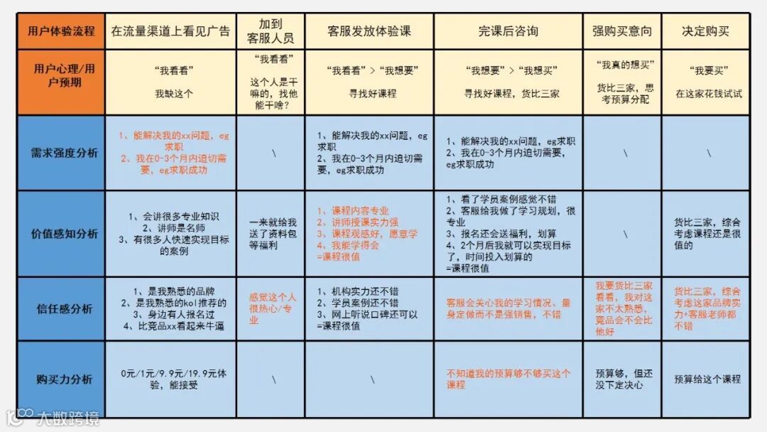 比如课程内容和营销内容不一致,即需求&产品不匹配,解决方案就是调整体验课或者调整前端营销内容,就可以归类到加强“需求强度”类别。