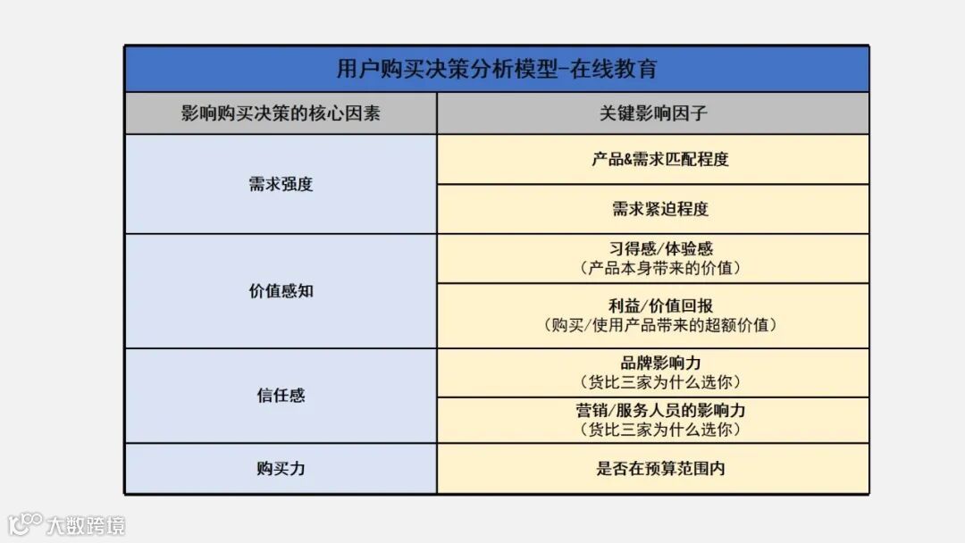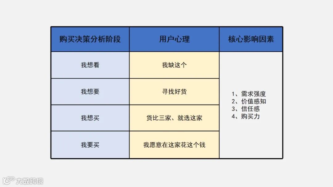 基本上用户在决定是否要购买一款产品时,都会经历这4个阶段,背后起到关键影响的4个因素分别是:需求强度、价值感知、信任感、购买力。