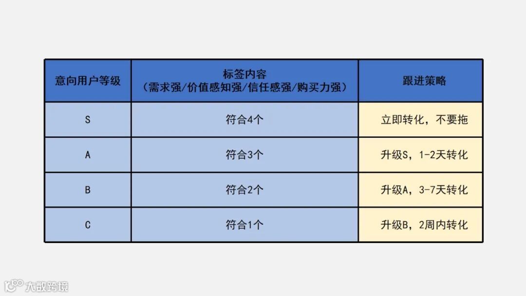 其次特别强调“需求紧迫程度”是因为不急迫的需求,没有办法在短时间内成交。这就要求我们能够识别高意向用户和泛流量用户。