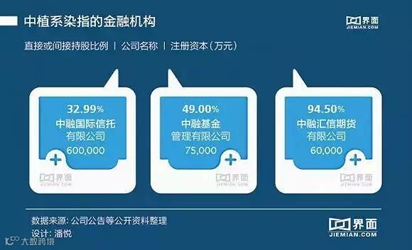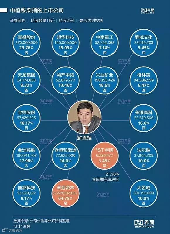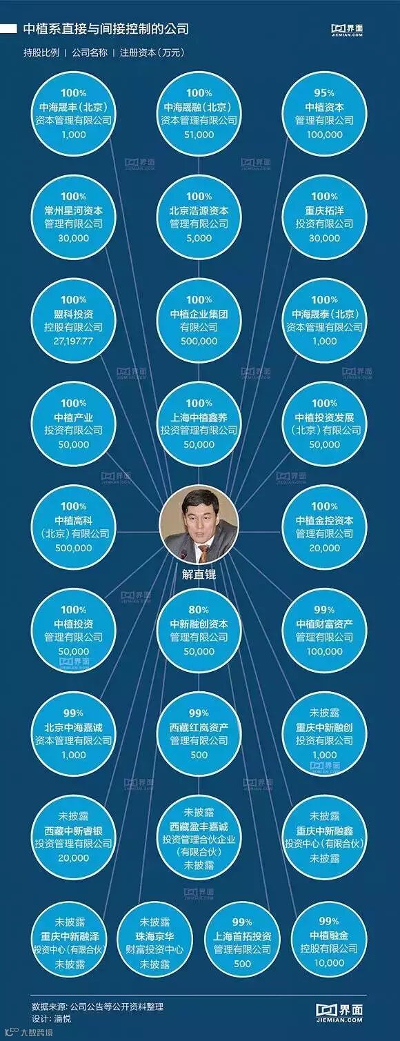 中植系已有信托、财富公司、并购基金、新金融、新能源及矿业板块等,解直锟直接持有或控制5%以上股份的境内外上市公司已经18家。