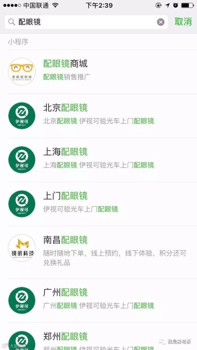那么,如何做到呢?其实很简单,利用一个平台+N个门店小程序的方式,多去占用关键词,一个主关键词,一系列的长尾关键词,比如说当我们搜配眼镜这个关键词的时候,就会出来这样的画面。