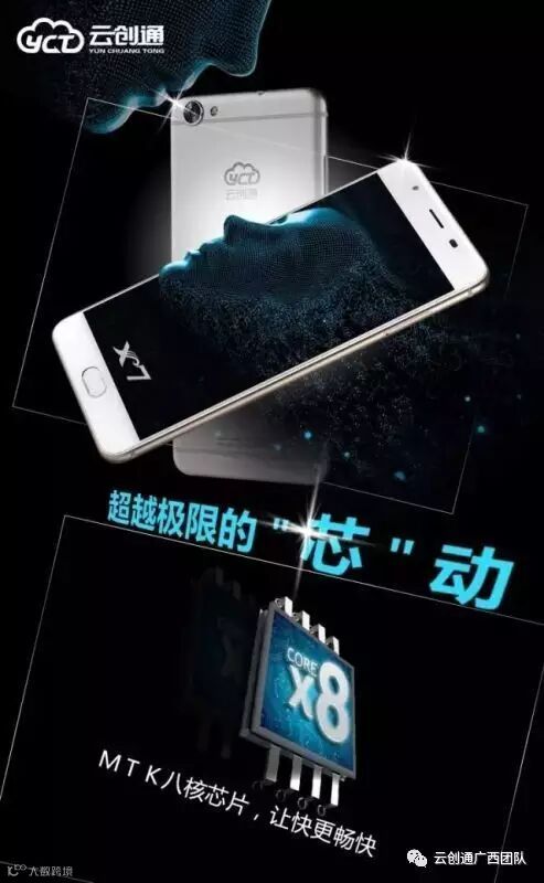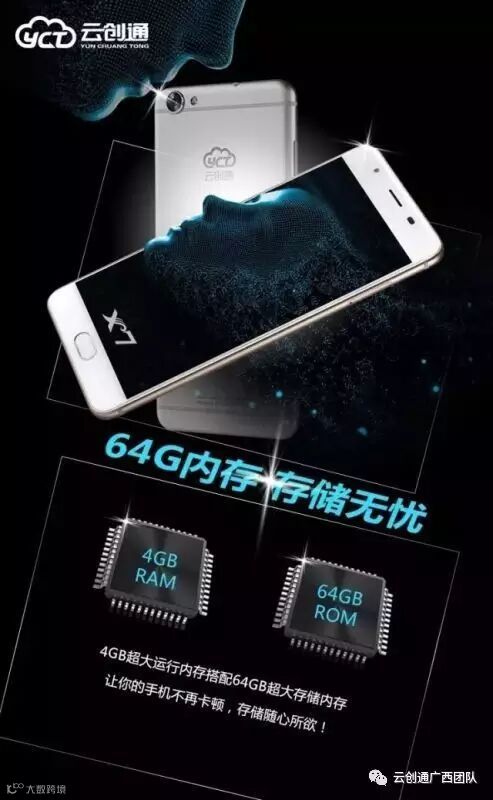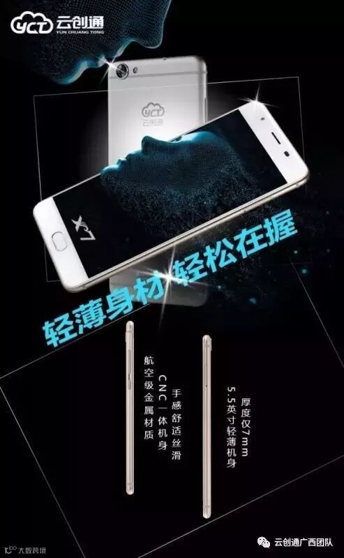 云创通X7创客智能营销手机亮点频频!24大创客营销功能!更高的配置,航空级全金属材质CNC一体机身。5.5英寸超薄原装魔丽屏。4GB超大运行内存+64GB超大存储内存的组合。支持中国移动,中国联通,两大基础运营商4G网络。最新前置指纹识别按键,解锁更方便,支付更安全!MTK八核芯片,让运行更快更流畅。美霸拍照功能,让你一秒变美。