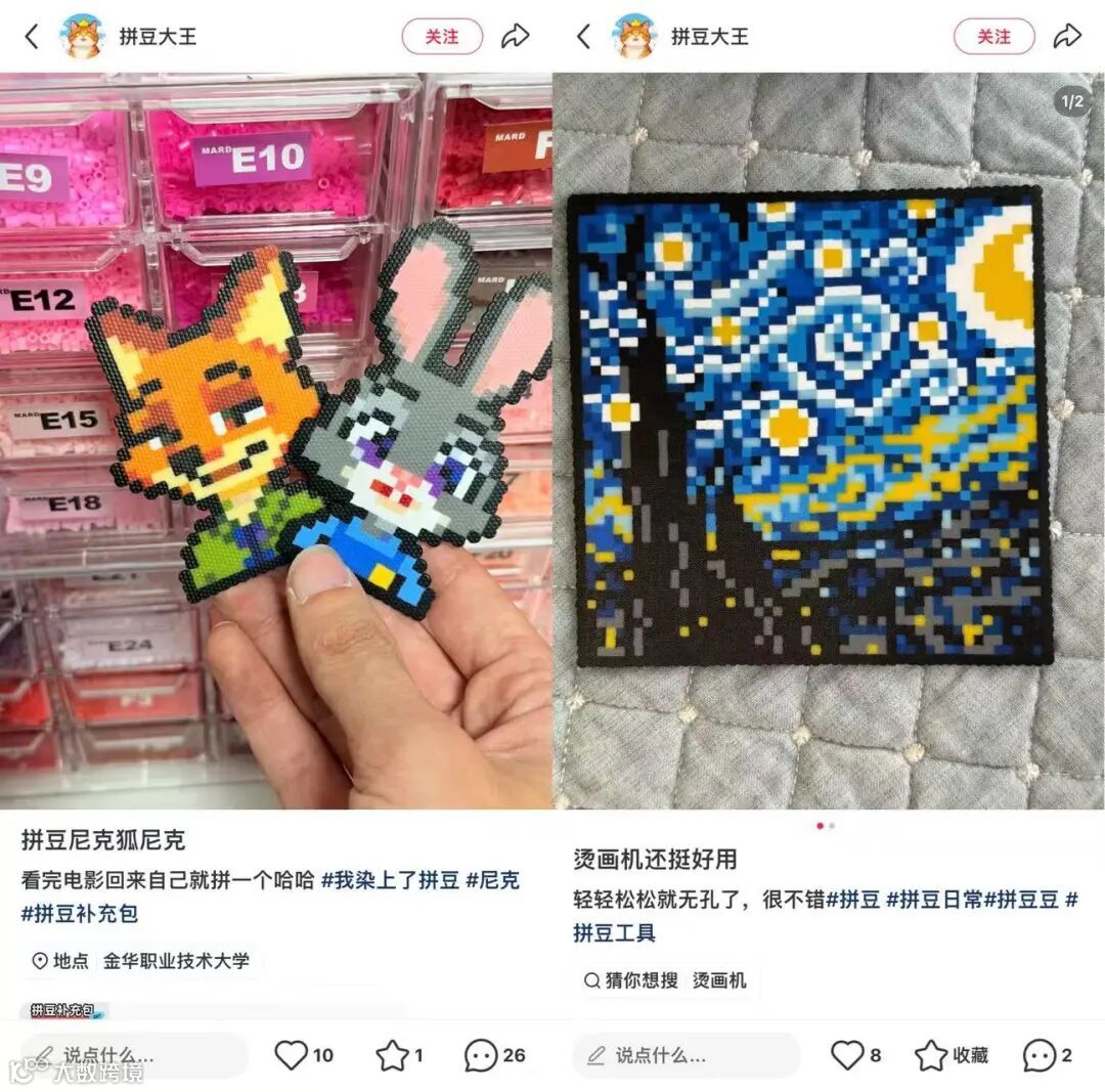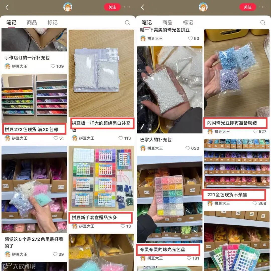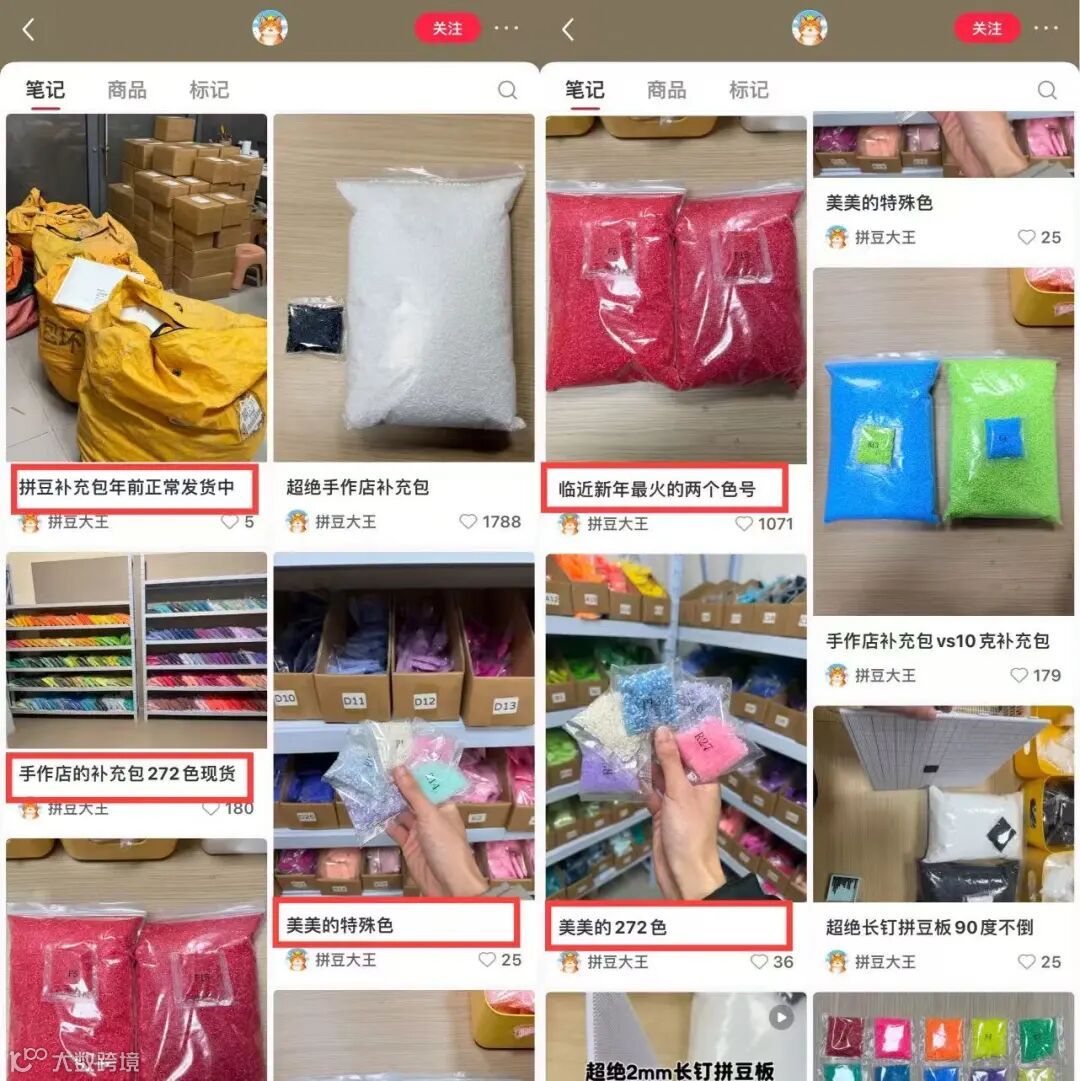 他大部分笔记都是“成品+仓库背景”的搭配,直接用实拍的拼豆live图,产品的颗粒感、颜色,这些细节一眼就能看见;