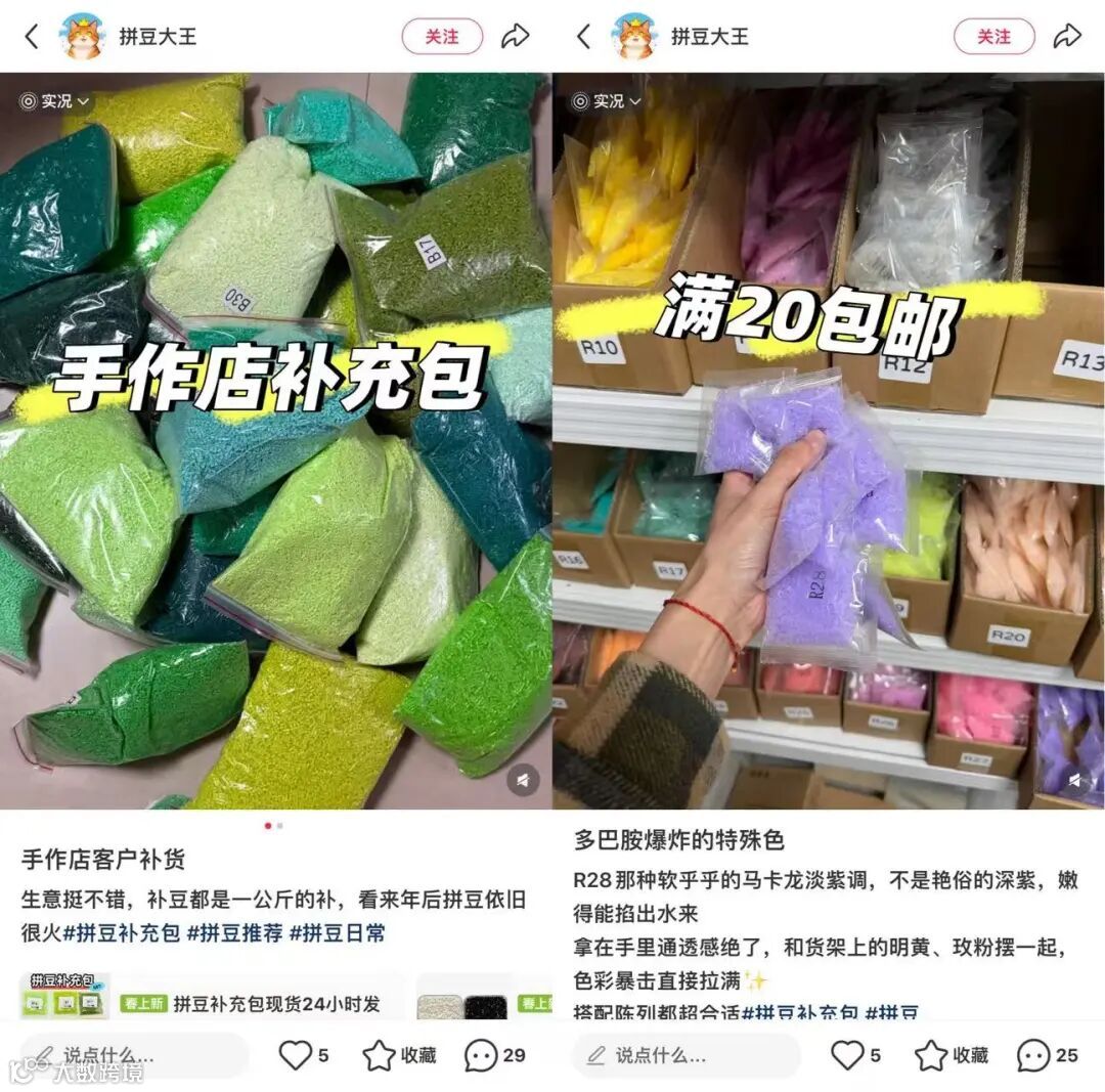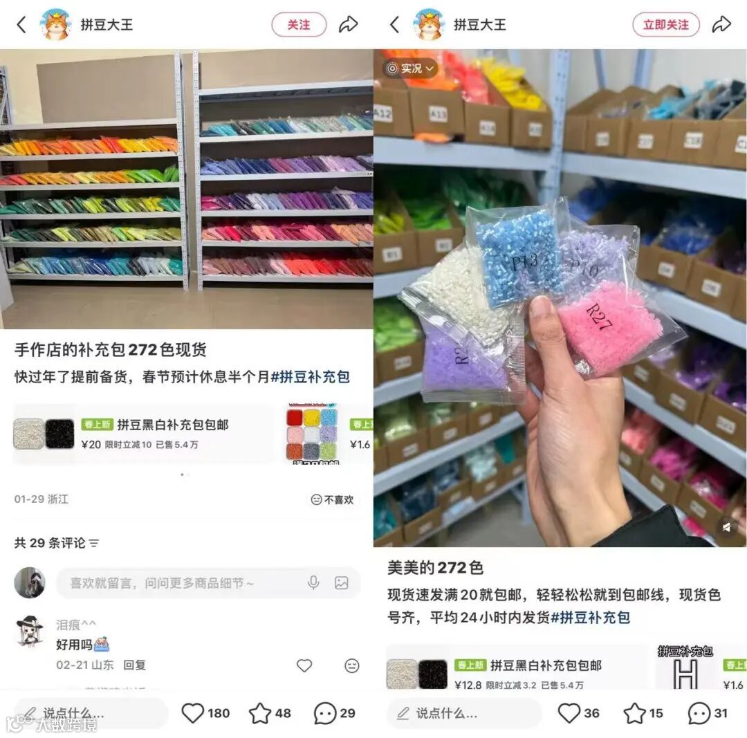 后面衬着堆满货的仓库,给人的感觉就是 “我是源头厂家,货多还便宜”,想要拼豆的人一眼就被勾住了。