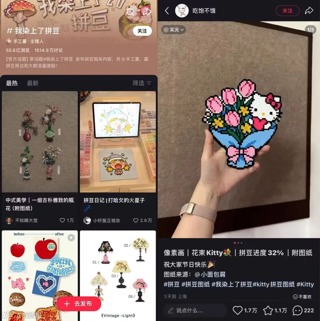 小红书上,“我染上了拼豆”的话题浏览量直接突破 55.6 亿,我这两天还总能刷到钥匙扣、冰箱贴的笔记。