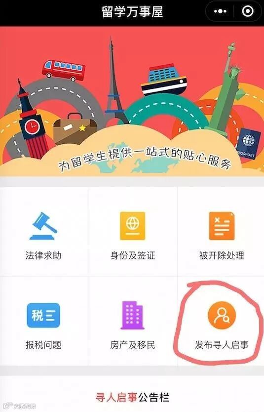 “留学生万事屋中”小程序的“寻人启事”功能,将会是失联人员生命保障的强力助手。在平台上发布寻人信息,不仅会得到当地警察、律师以及相关人员的帮助,同时也会在相关媒体上扩大传播,缩短搜寻时间。