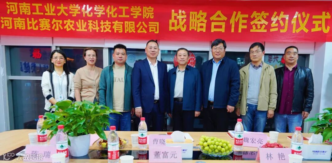 河南工业大学/化学化工学院/-曹晓雨院长/教授、河南工业大学/化学化工学院-魏宏亮教授、河南工业大学/化学化工学院党政办主任-李珂主任、河南省科学院化学研究所/赵永德所长、河南比赛尔农业科技有限公司/董事长/林艳女士、总经理董服灿、行政副总经理陈瑞、生产技术副总刘现杰共同出席签约仪式。