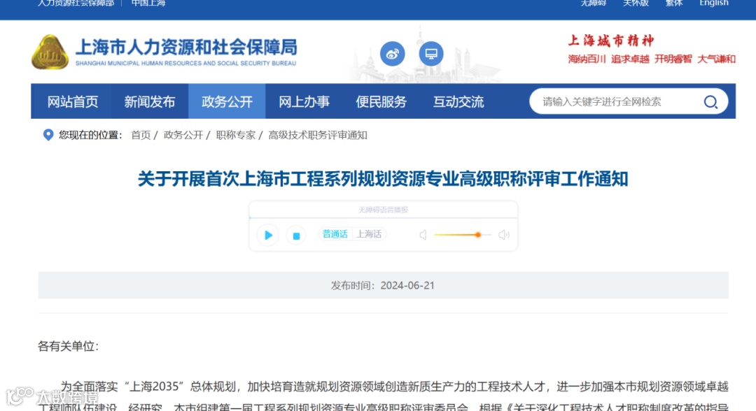 2024年6月21号上海市工程系列规划资源专业高级职称评审委员会发布了《关于开展首次上海市工程系列规划资源专业高级职称评审工作通知》
