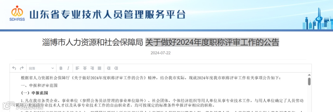 7月22日淄博市人力资源和社会保障局发布了《关于做好2024年度职称评审工作的公告》