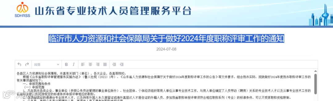 7月8号临沂市人力资源和社会保障局发布了《临沂市人力资源和社会保障局关于做好2024年度职称评审工作的通知》