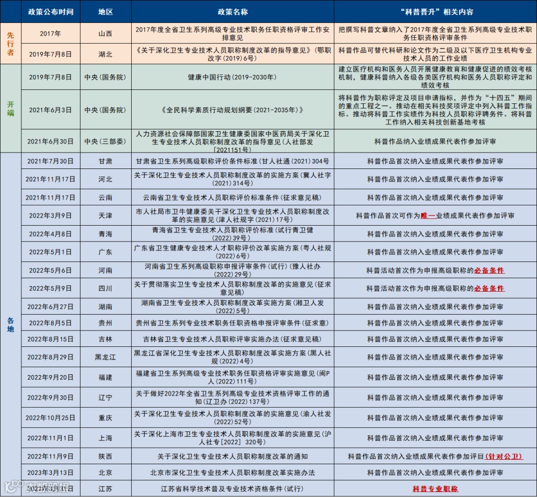 据不完全统计,上海、河南、广西、四川、安徽、湖南、福建、辽宁、黑龙江、山东等地都提出将健康科普作为职称评审的条件之一。