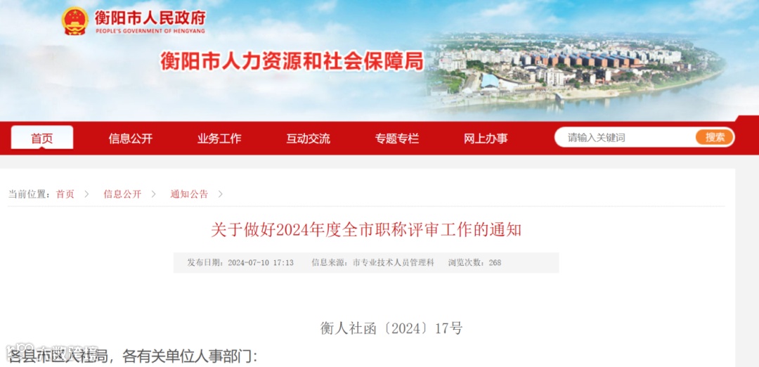 7.10号衡阳市人力资源和社会保障局发布了《关于做好2024年度全市职称评审工作的通知》