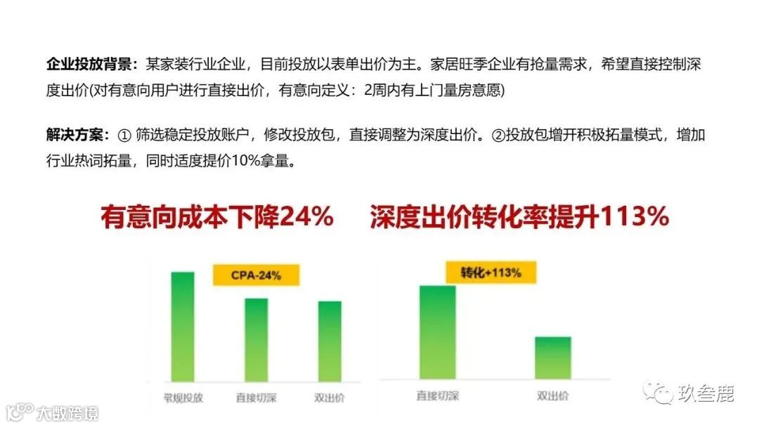 实例一:某家装行业企业,在家居旺季时将【表单出价投放】调整至【深度出价】,直接对有意向用户进行出价,控制成本。搜索深度转化功能,相比常规浅层投放有意向成本下降24%,转化量相比双出价提升113%。