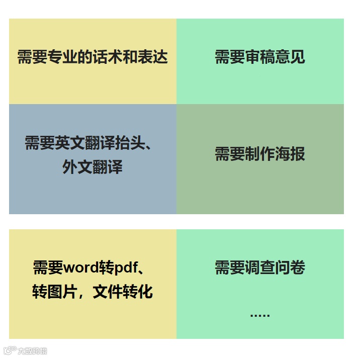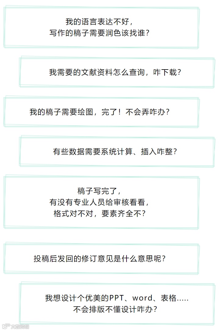 校对、语言文字润色、就稿件的科学或学术内容提供建议、帮助收集数据、帮助选择投稿期刊、帮助回复同行评审意见等。涉及开展研究、撰写报告、调查问卷、出版或传播研究成果的学术出版服务。