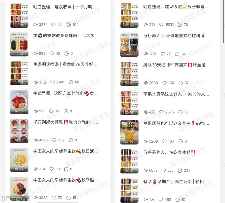 除此外,我发现,养生食养类的账号在小红书上的曝光是非常大的,也让我更加坚定想要做好这个赛道的内容。